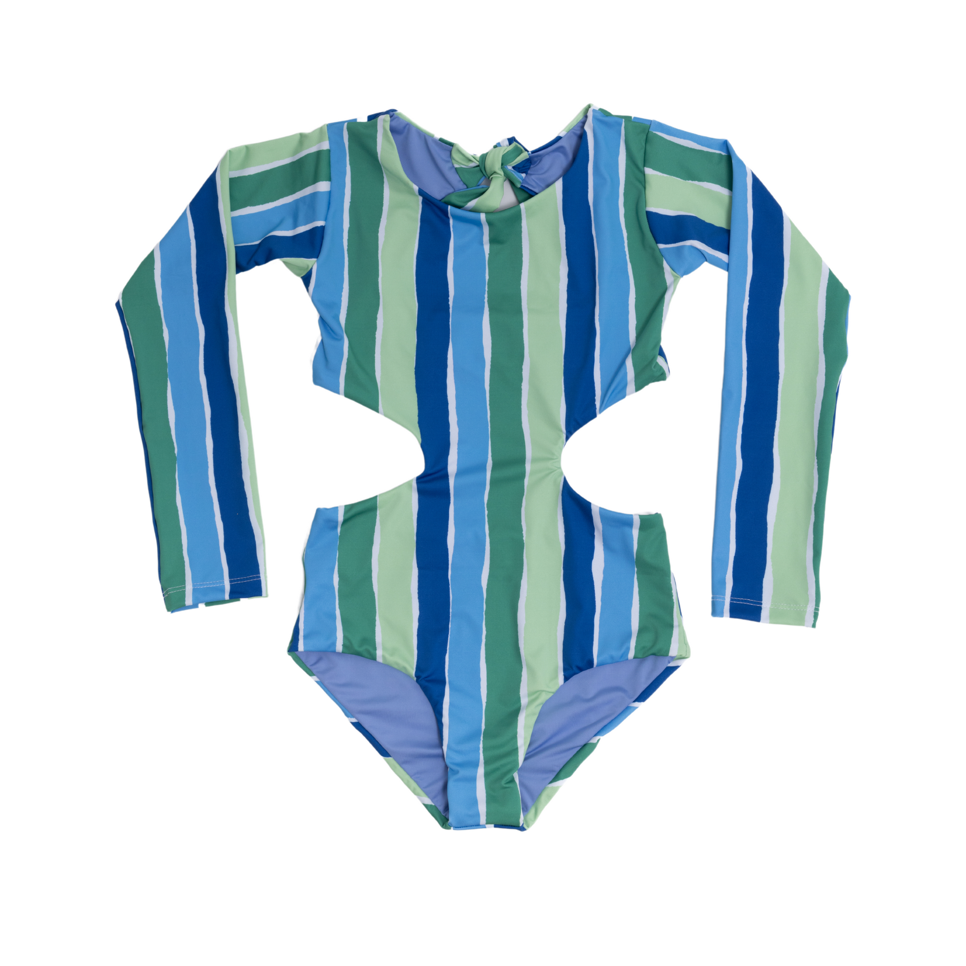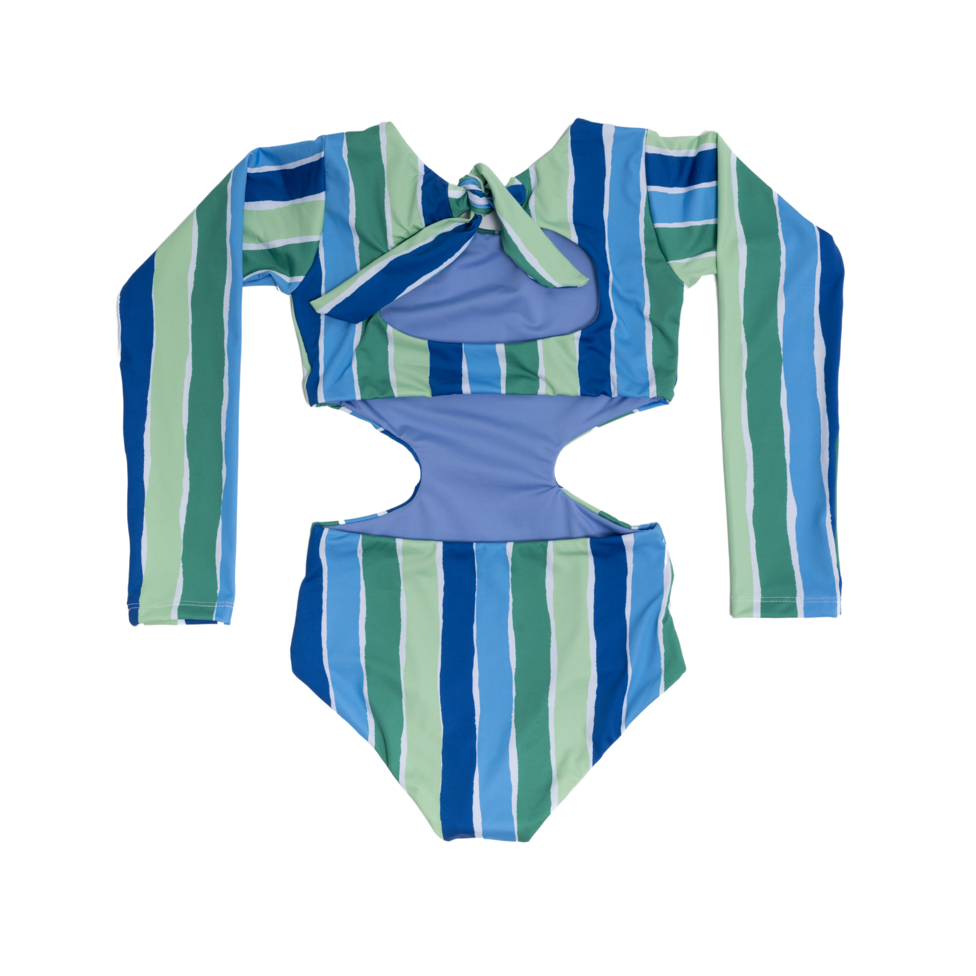 Vestido de baño entero manga larga con lados abiertos. Amarre de un lazo.